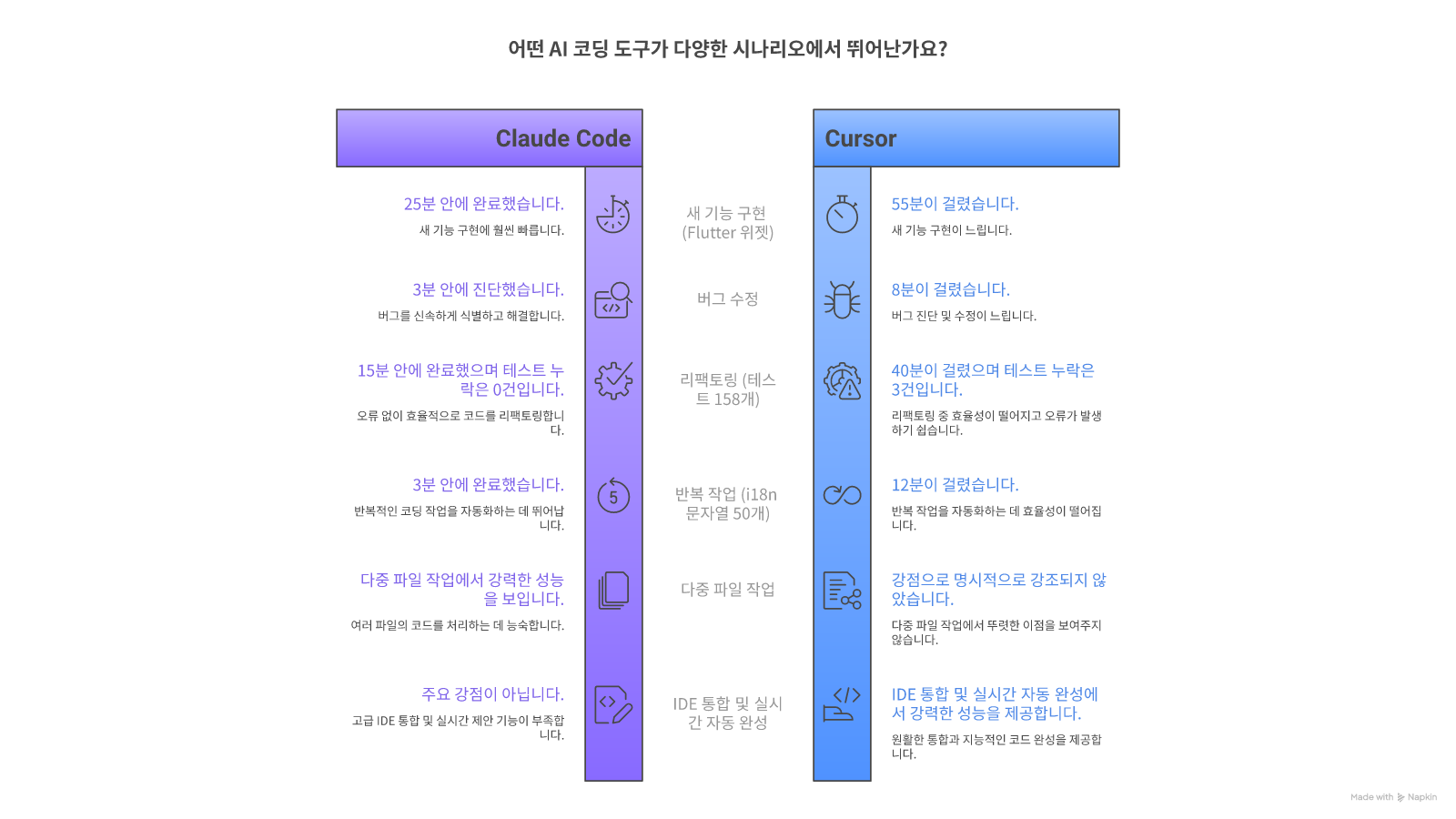 Claude Code와 Cursor를 Flutter 앱 개발, 블로그 구축 등 실전 프로젝트에서 직접 비교했습니다. 속도, 정확도, 비용, 워크플로우까지 데이터 기반으로 분석합니다.