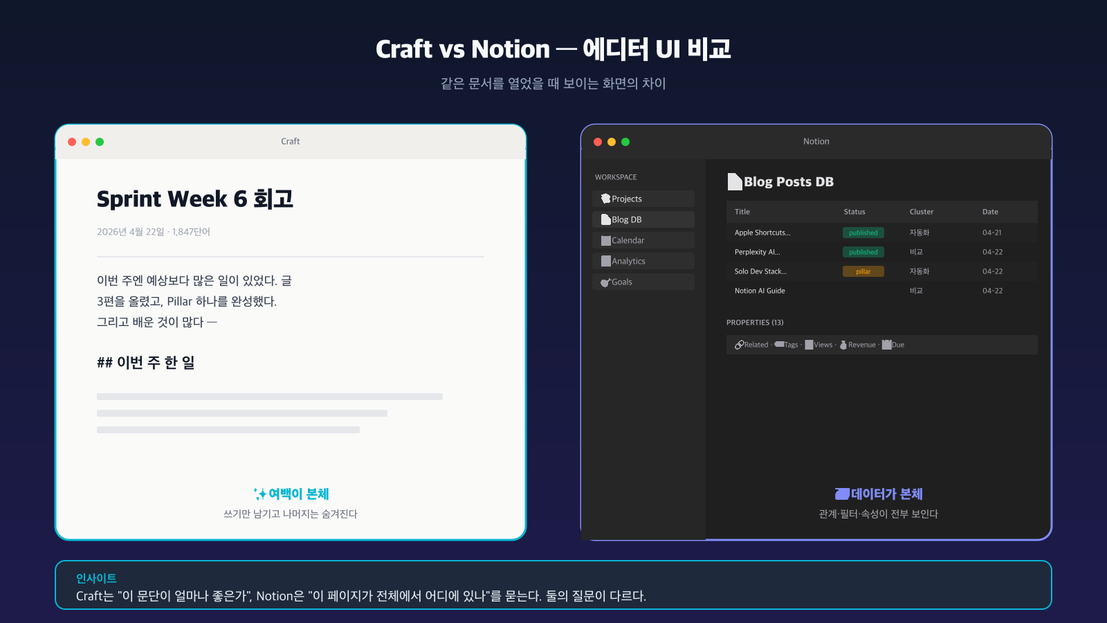 같은 "블록 기반 노트앱" 이지만 UI 철학이 다르다. Craft는 "이 문단이 얼마나 좋은가"를 묻고, Notion은 "이 페이지가 전체에서 어디에 있는가"를 묻는다. 해결하려는 문제가 다르니 선택 기준도 달라진다.