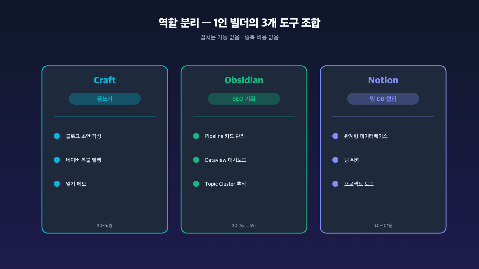 나의 선택: Craft = 글 초안 + 복붙 발행, Obsidian = SEO 기획·추적, Notion = 안 씀 (1인이라 관계형 DB 필요 없음). 1인 개발자 자동화 스택의 "#8 Craft" 항목에서도 이 역할 분리가 왜 의미 있는지 자세히 정리했다.