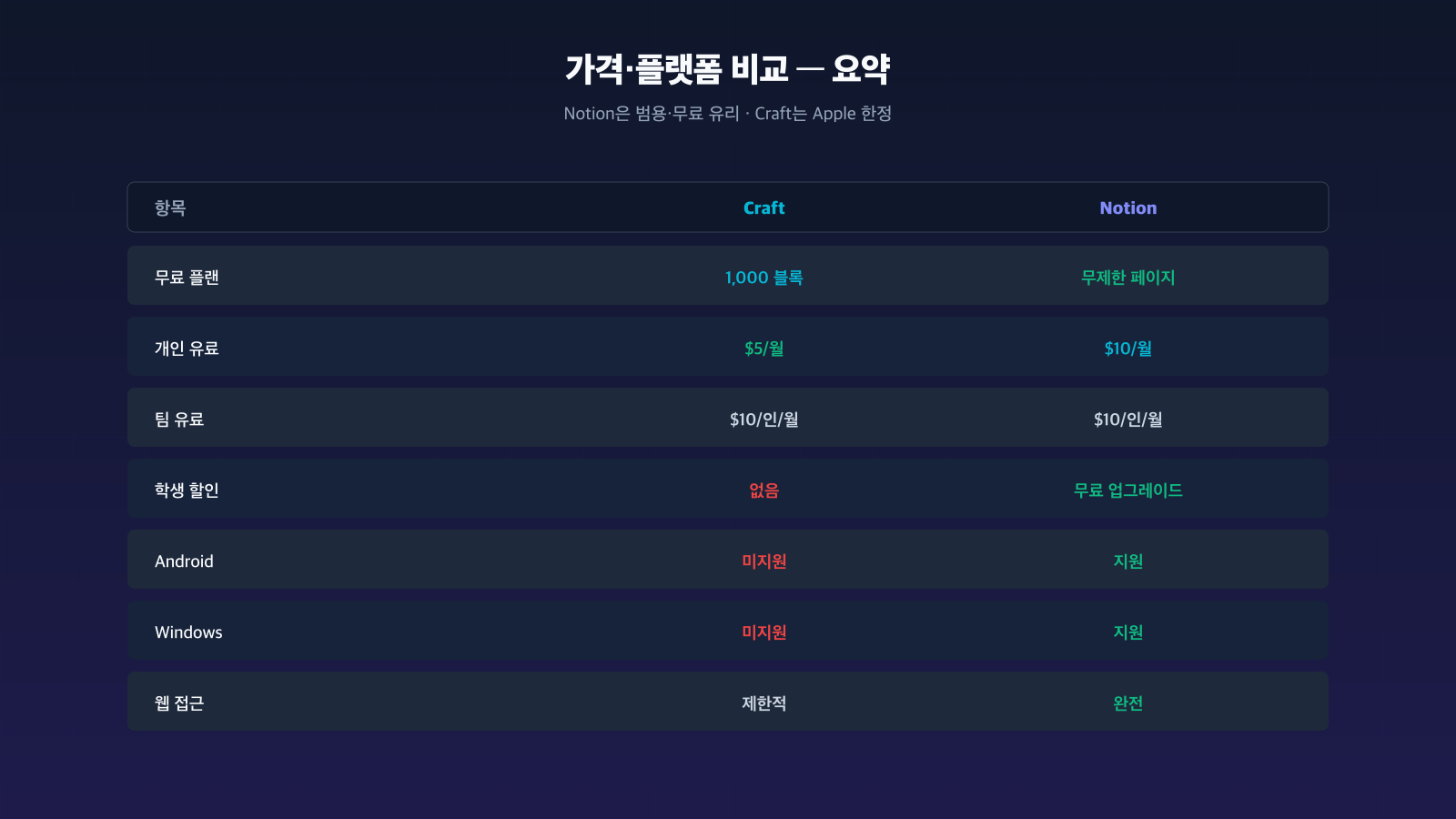 - 플랫폼 호환. Android·Windows 동료와 공유해야 한다면 Notion 외에 선택지가 없다. Craft는 2026년 현재도 Apple 전용.